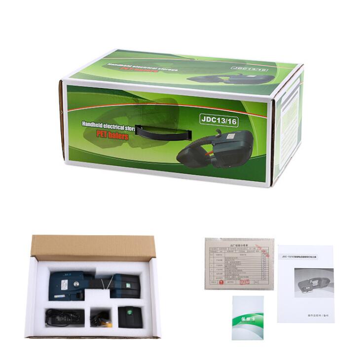 摘要: 名稱:電動打包機 型号:JDC13/16 适合帶子:PP帶/PET塑鋼帶通用 适合帶寬:13-16mm*0.4-1.2mm 充電時間:90分鍾 打包速度:5-10秒/條 最大拉力:60-2800N可調 電 池:锂電池3.0Ah 機器重量:約2.7Kg(機器淨重) 電池重量:0.35Kg 包裝尺寸:360*140*130mm